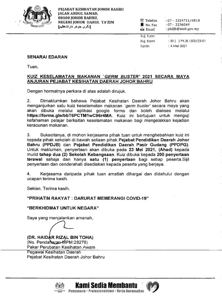 Pejabat kesihatan daerah johor bahru. Surat Kuiz On9 10052021101448 Pdf